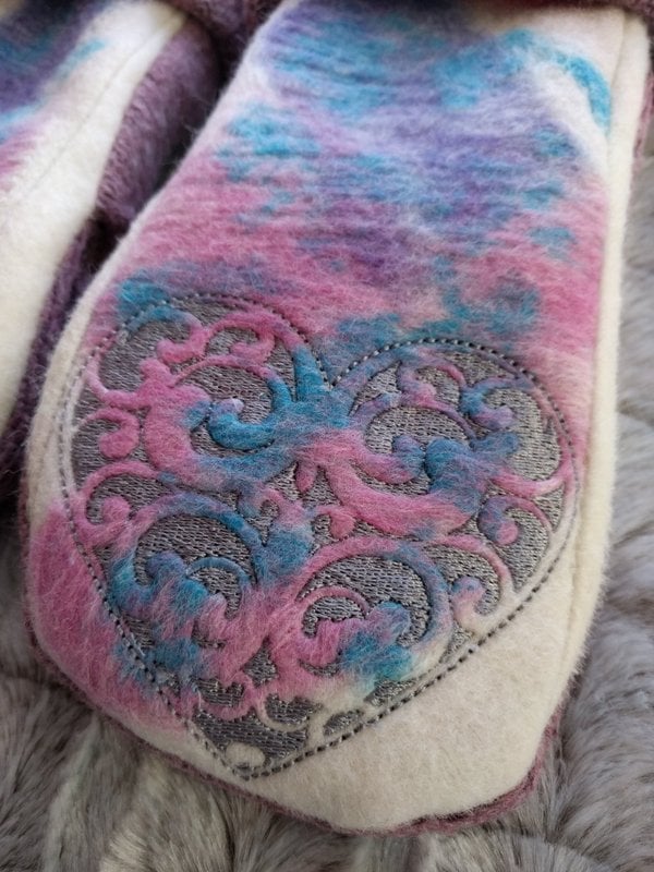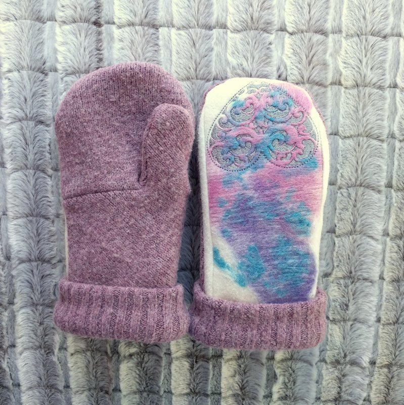 made using wool/wool blend sweaters and felting different colors of wool on top. heart embroidered on fingers in silver. pink palm/fingers and hem cuff. Inside is fleece lined.